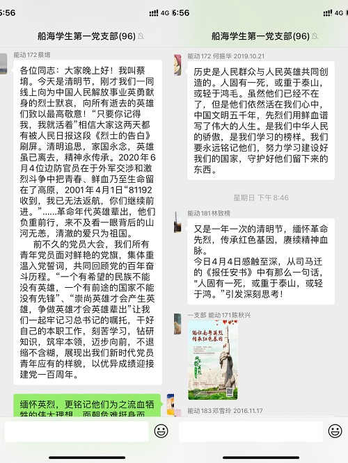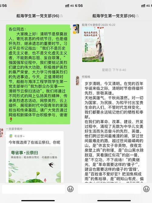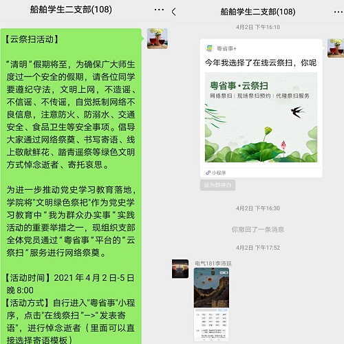 (船舶与海洋工程学院 供稿) 为深入开展党史学习教育,进一步发扬红色传统、传承红色基因、赓续精神血脉,坚守共产党人的初心使命,船海与海洋工程学院员工党支部于4月3日-5日组织员工党员、入党积极分子开展“我为群众办实事”线上祭扫实践活动。