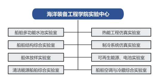 实验中心有船舶多功能水池实验室、船舶结构综合实验室、清洁能源船舶综合实验室、船舶空调与冷藏综合实验室等基础实验室和专业实验室共8个。
