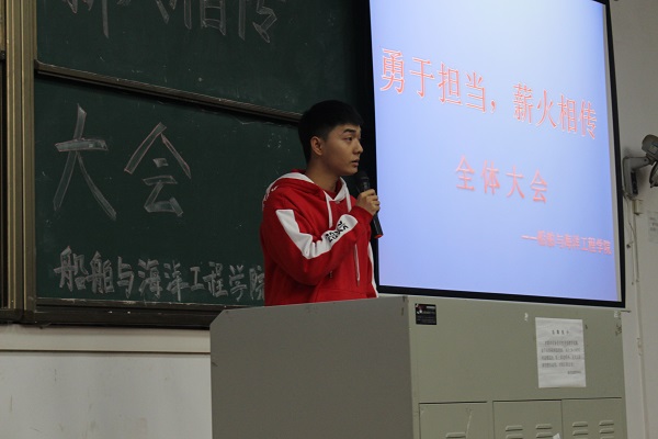 此次会议围绕前期工作回顾、近期工作部署和员工干部职责三方面展开。会议伊始,由分团委书记朱威老师上台致辞。他首先带领大家回顾了过去一学期以来分团委员工会所举办的活动,在对大家取得的成绩表示肯定的同时,希望大家继续为荣誉奋斗,为理想为战。除此以外,他对大一的干事们提出新的要求,希望在勇于担当的同时,传承师兄师姐的优良品质,展现船舶学子的风采。