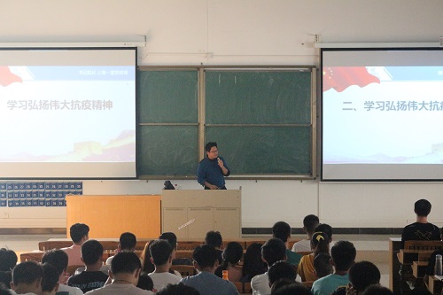 最后,陈经理以身边人为例,向同学们展示了船海师生疫情期间勇担时代使命的活动照片及事迹,包括员工返校工作的教师志愿者、党员服务岗开展的师生服务、教师党员志愿献血爱心活动以及师生党员进行社区志愿服务活动等,告诉同学们榜样就在身边,弘扬抗疫精神可以从身边做起,从小事做起。寄语同学们要胸怀家国、志存高远,自觉践行社会主义核心价值观,把爱国情怀根植于内心深处,用青春奋斗来担当起民族复兴的历史使命和时代责任。